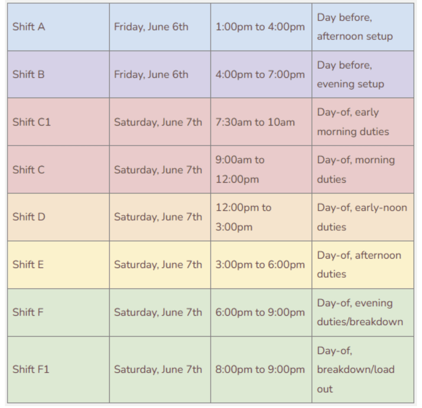 Shift(s) sign-up is available following registration. Unfortunately, due to the nature of the volunteer roles, no partial shifts will be permitted. As of January 2026, the shift letter designations, color codes, and time slots are as follows: